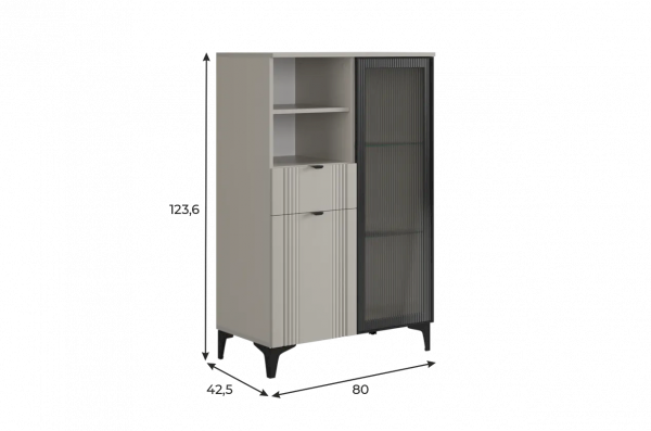 Дизайн комода продуман до мелочей: с одной стороны расположена стеклянная дверца, за которой находится просторное пространство для хранения. С другой стороны – ниша с открытой полкой, выкатной ящик и ещё одна глухая дверца, что позволяет гибко организовать хранение и поддерживать порядок в доме.